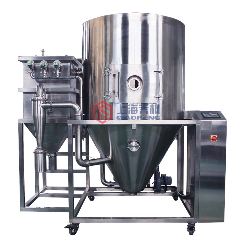 3、當干燥室進口溫度達到目180℃~220℃時,開啟離心噴頭,當噴頭達到最高轉速時,開啟進料泵,加入料液,進料量應由小到大,否則將產生粘壁現象,直到調節到適當量。料液的濃度應根據物料干燥的性質溫度來配制,以保證干燥后成品有良好的流動性;