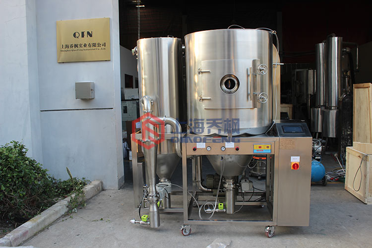噴霧干燥機是流化技術用于液態物料干燥的一種較好的方法?;驹硎强諝馔ㄟ^過濾器和加熱器,進入干燥塔頂部的空氣分配器,通過熱風分布器的熱空氣呈螺旋狀均勻地進入干燥室。料液由料液貯罐經過濾器由泵或者壓縮空氣送至干燥塔頂的霧化器,使料液噴成極小的霧狀液滴,料液與熱空氣并流接觸,接觸表面積大大增加,水份迅速蒸發,在極短的時間內干燥為成品。成品由干燥塔底部和旋風分離器排出,收集瓶回收,廢氣經濾袋過濾器收集細粉后由風機排出。