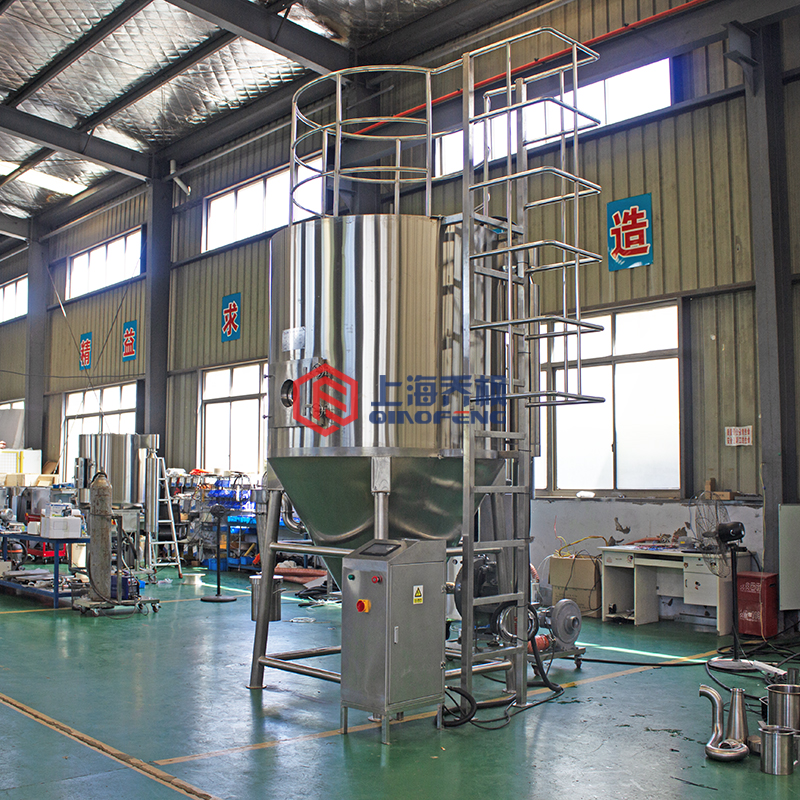空氣經過濾和加熱,進入干燥器頂部空氣分配器,熱空氣呈螺旋狀均勻地進入干燥室。料液經塔體頂部的高速離心霧化器,(旋轉)噴霧成極細微的霧狀液珠,與熱空氣并流接觸在極短的時間內可干燥為成品。成品連續地由干燥塔底部和旋風分離器中輸出,廢氣由引風機排空 。