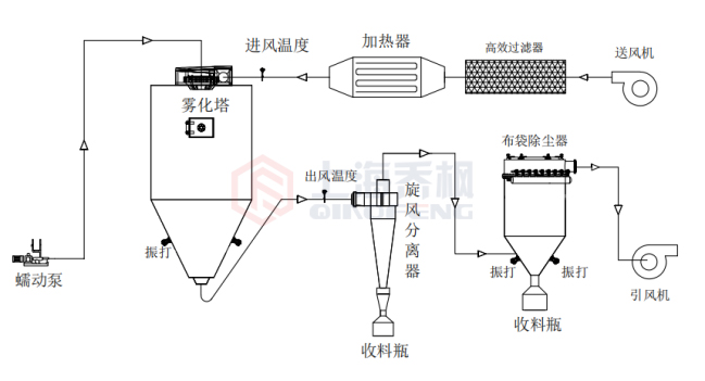 特點4、噴霧干燥機簡化了工藝流程。蒸發(fā)、結(jié)晶、過濾、粉碎等操作過程可通過噴霧干燥一步完成。由于離心霧化器產(chǎn)生的霧群基本在同一水平面上,霧滴沿徑向和切割的合成方向移動,幾乎沒有軸向的初始速度,因此干燥器的直徑相對較大。所以干燥的物料粒徑均勻性好,流動性和溶解性好。