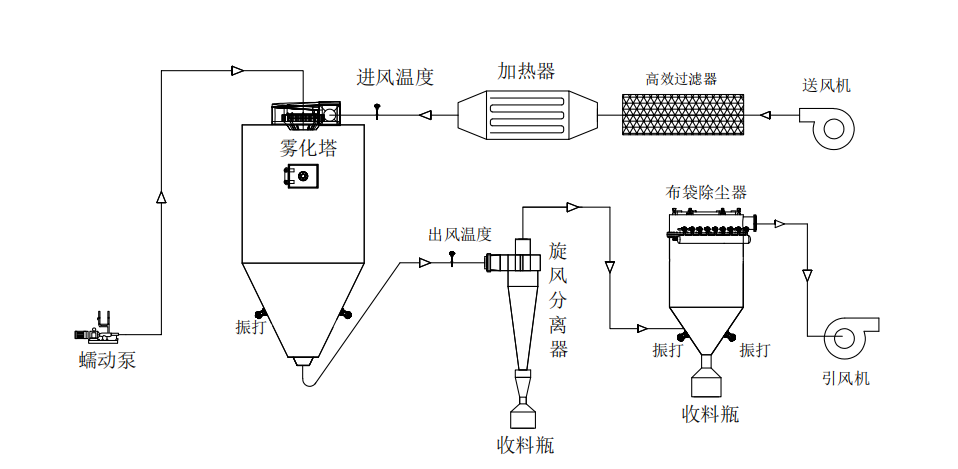 液體原料被泵入噴霧器,在噴霧器的壓力作用下,被噴霧成微小的霧滴。